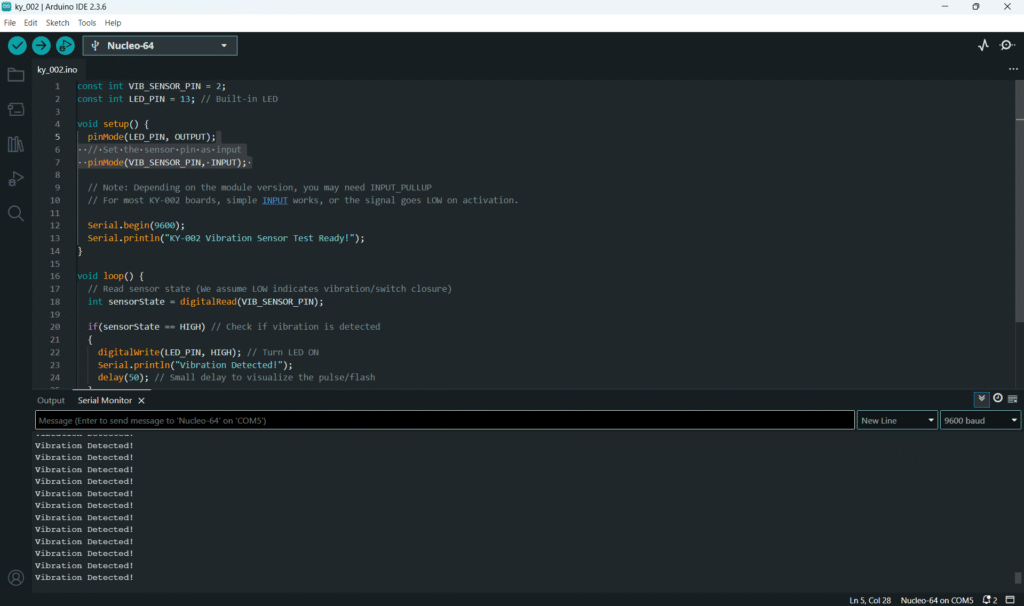 3. The on-board LED should flash or stay lit briefly, and “Vibration Detected!” should appear in the Serial Monitor.