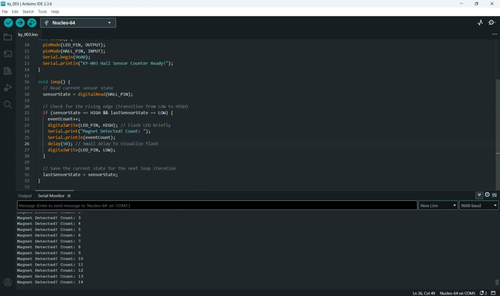 - The LED should flash briefly and the counter in the Serial Monitor should increment by 1 for each magnetic event, demonstrating clean, non-bouncing detection. You may need to flip the magnet to find the correct pole that triggers the sensor.