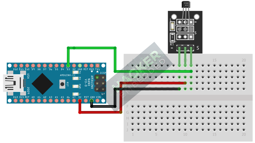Wire the module to the Arduino as follows. The specific Hall sensor used on the module is usually latched or bipolar and often outputs LOW when a specific magnetic pole (South) is detected.
