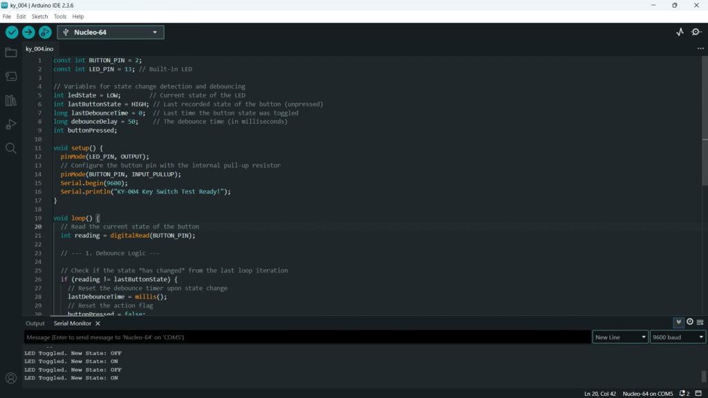 - The Serial Monitor should print the status change cleanly, without multiple “Toggled” messages per press, thanks to the debouncing code.