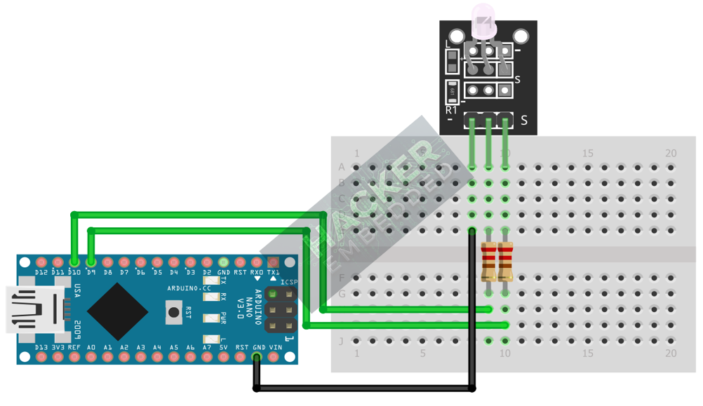 Ensure the – / GND pin is directly connected to Arduino GND. Both R and G pins must pass through a resistor before connecting to the Arduino digital pins.