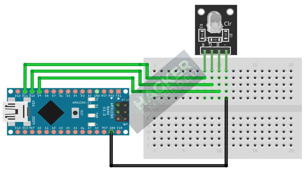 | Code compiles but no output. | Pin assignment error or using non-PWM pins. | Ensure the color pins are wired to the PWM pins on the Arduino (∼ marks next to pin numbers: 3, 5, 6, 9, 10, 11). |