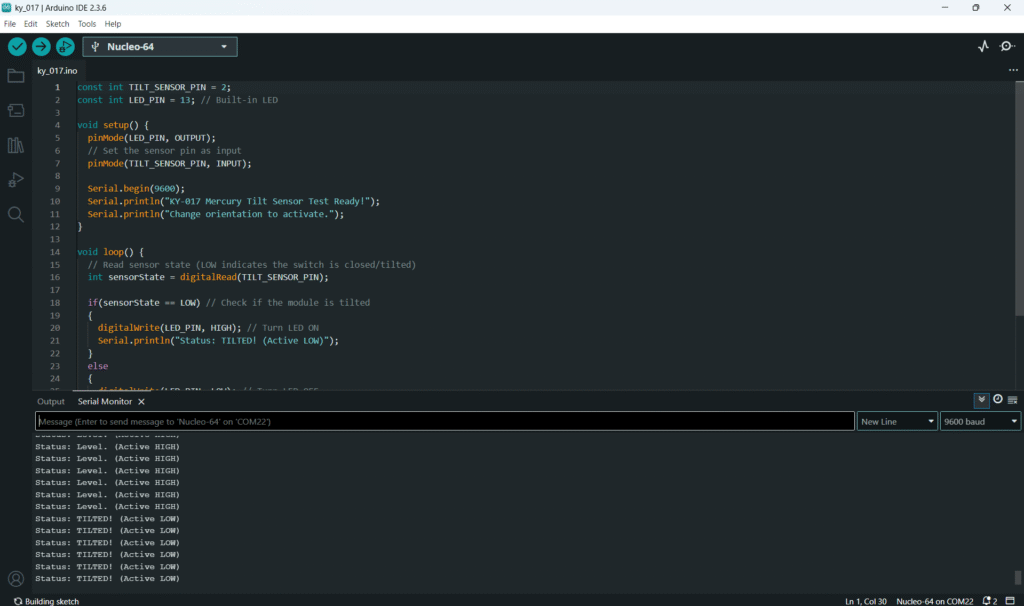 - Tilt the KY-017 module past its activation angle: the LED should turn ON, and the monitor should show “Status: TILTED!” continuously until leveled again.