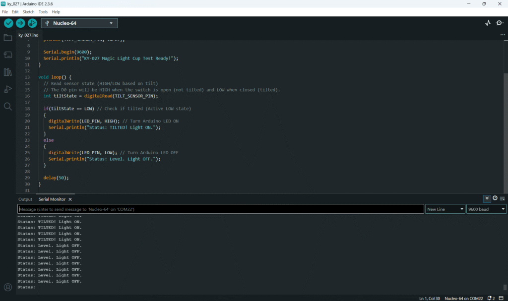- Tilt the KY-027 module past its activation angle: the Arduino LED should turn ON, and the monitor should show “Status: TILTED! Light ON.”