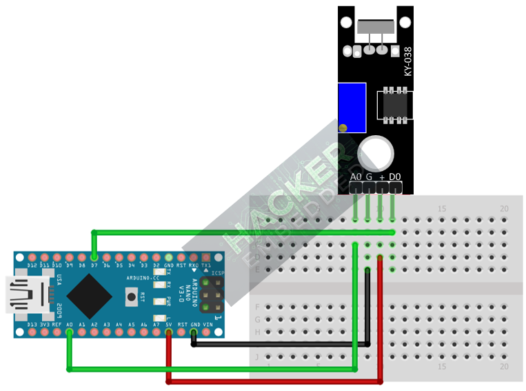 - Connect the D0 pin of the KY-038 to Arduino Digital Pin 7 (Digital Input).