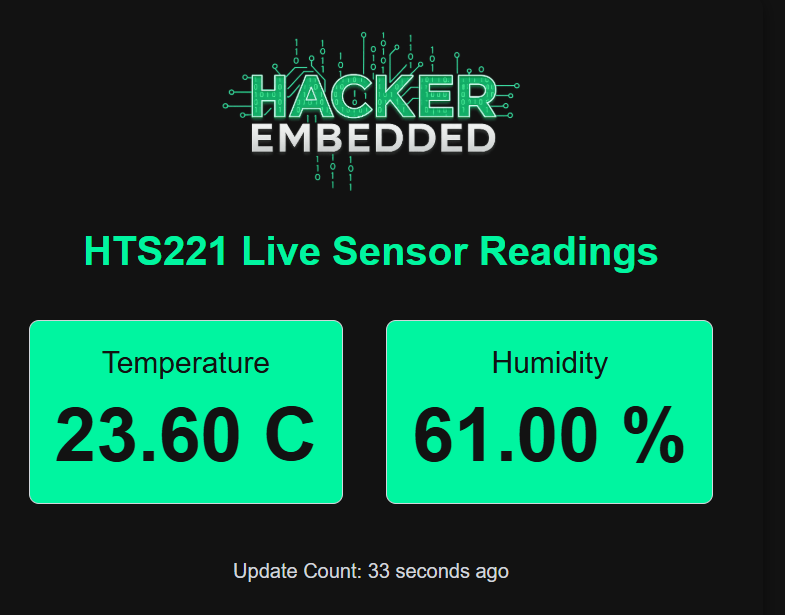The primary goal is to transform the ESP32 into a live environmental monitoring station. We will host a simple, dynamic web dashboard that automatically updates using an HTML meta refresh tag. This allows any device connected to the same network to view the HTS221’s readings in real-time without needing a dedicated mobile app or constant manual page refreshes, creating a fully functional, network-enabled sensor solution.
