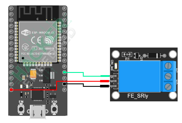 Important Note on Relay Power: For reliable operation, especially when switching a load, it is best practice to power the relay coil (KY-019 VCC/GND) from an external 5V supply rather than the ESP32’s 5V pin, which is typically derived from the USB port and may not provide enough stable current. The GPIO 2 signal line connects the ESP32’s logic to the relay’s optoisolator.