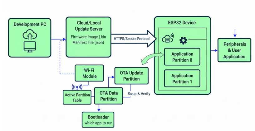 - Cloud/Local Update Server: Hosts the new firmware image (typically a .bin file) and potentially a manifest file (e.g., json) describing the update.