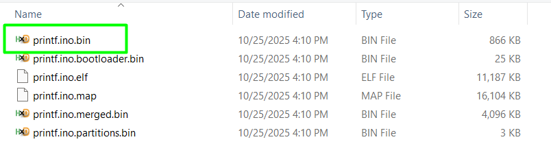 - The IDE will generate a .bin file in the sketch folder. This is the file you upload via the web interface.