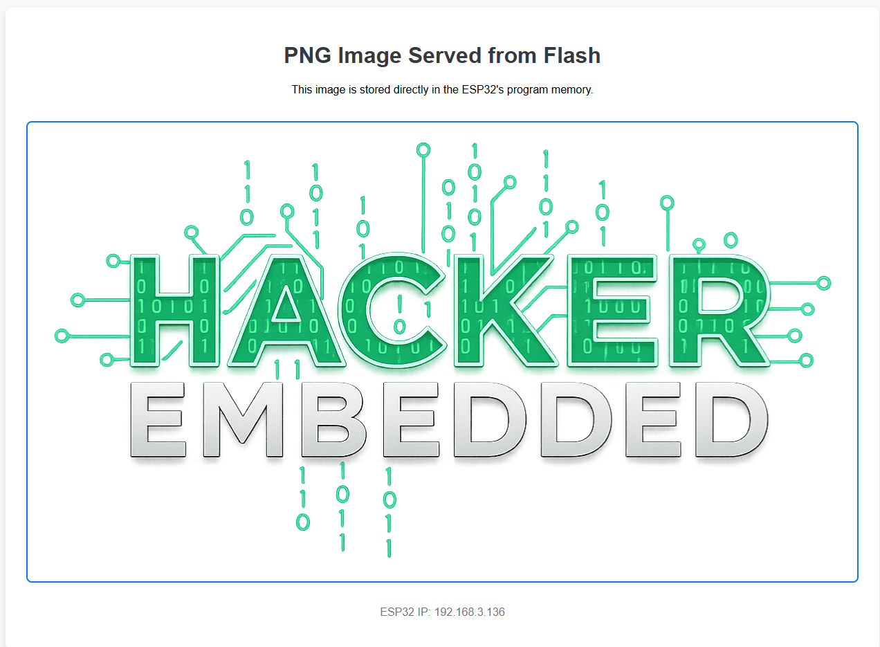 You have successfully embedded and served a binary image file from the ESP32’s Flash memory:
