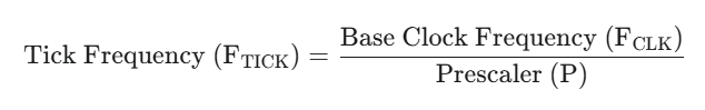 The Prescaler (P) divides the base clock frequency to slow down the counter, determining the timer’s tick rate. The tick is the smallest unit of time the timer can measure.
