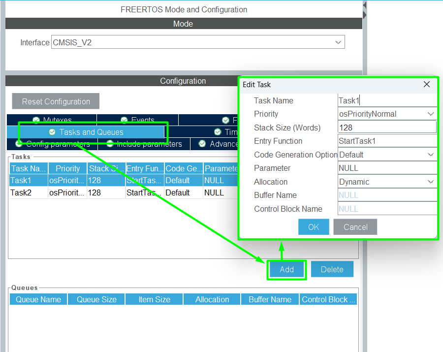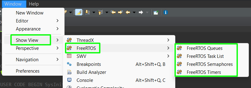 - Select FreeRTOS -> FreeRTOS Task List and FreeRTOS Queues and Semaphores.