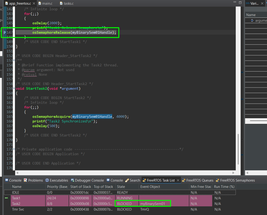 - Binary Semaphore: Think of this as a single key. A task (or ISR) “Gives” the key, and another task “Takes” it. It has only one ‘token’. If the key isn’t there, the task stays in a Blocked state. It is primarily used for Synchronization to synchronize one action.