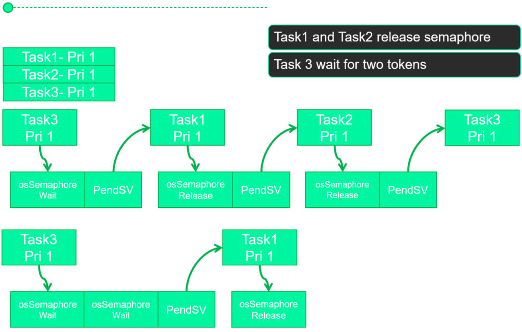 Semaphores are quite useful for event-driven firmware. By using Binary Semaphores for task synchronization and Counting Semaphores for resource management, you eliminate the need for “spinning” CPUs and unpredictable global flag, no more endless polling for flags.