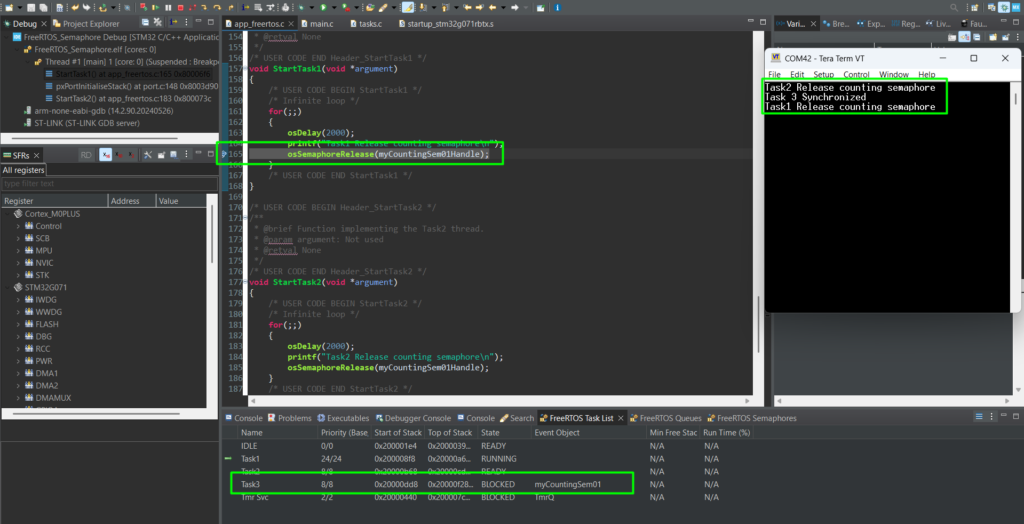 - You can now see the current count of your semaphores and which tasks are currently blocked waiting for them.