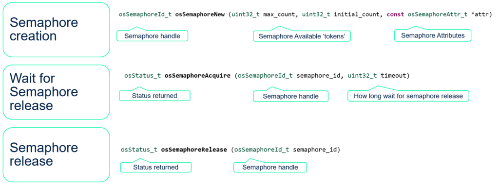 Create (Counting) | xSemaphoreCreateCounting() | osSemaphoreCreate() | osSemaphoreNew(max, initial, …) |