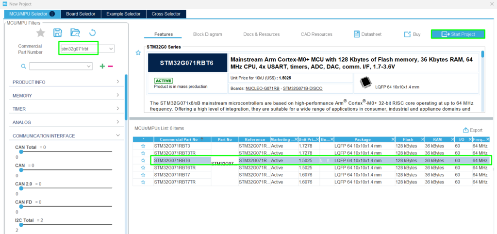 Create a new project: Select the STM32G071RB, the one available on the NUCLEO-G071RB