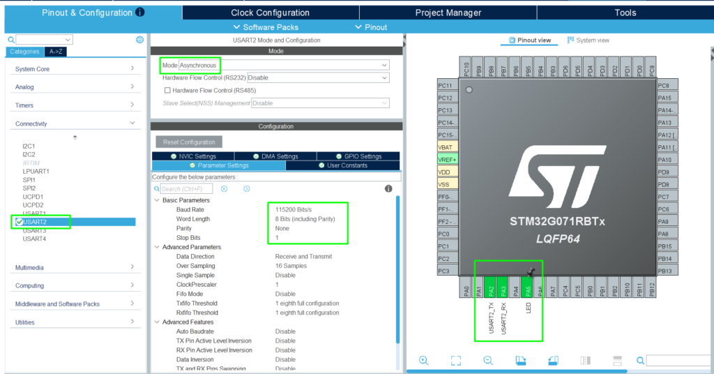 Add the USART2 (PA2 and PA3) for simple printf and PA5 for the LED available on the board: