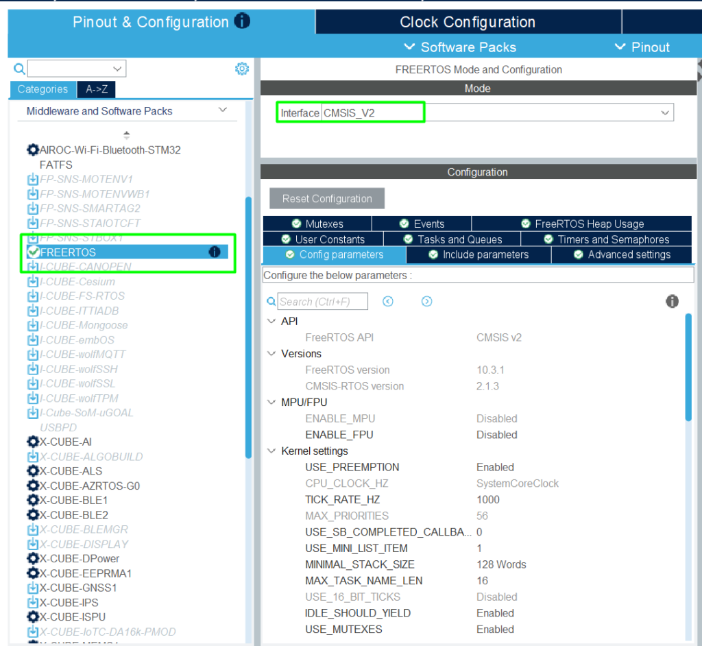 Add the FreeRTOS Middleware and select the API, in this case, CMSIS-V2: