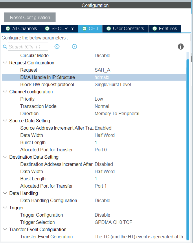 • Using a simple state machine in the main loop with HAL_SAI_TxCpltCallback() to chain transfers.