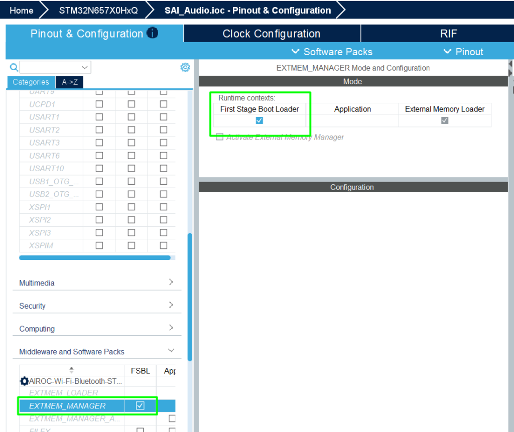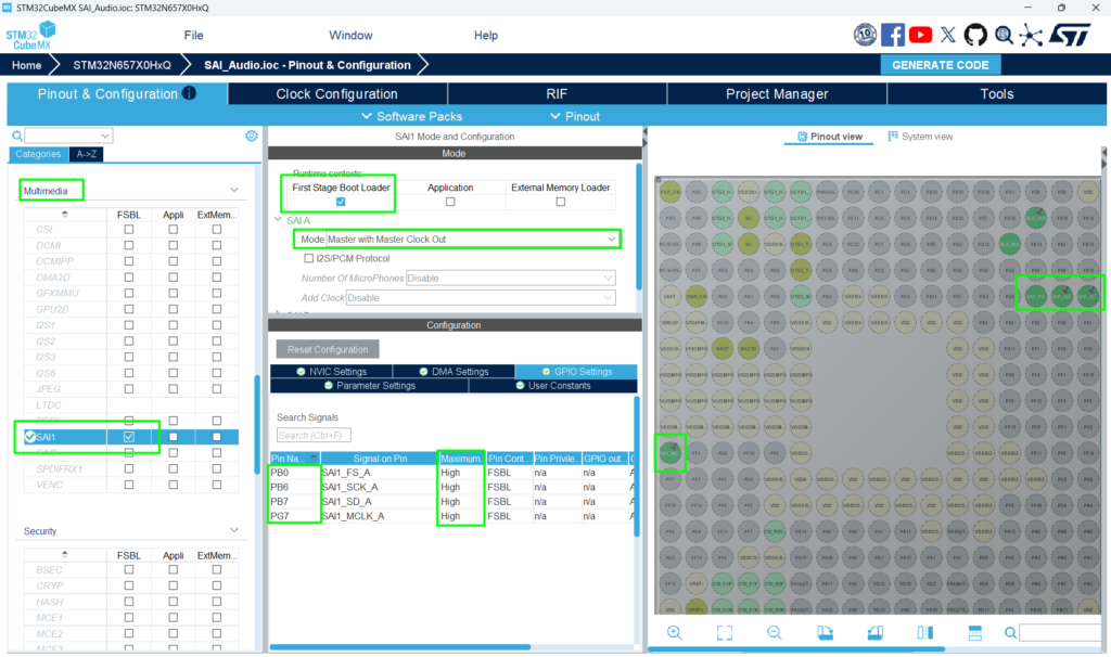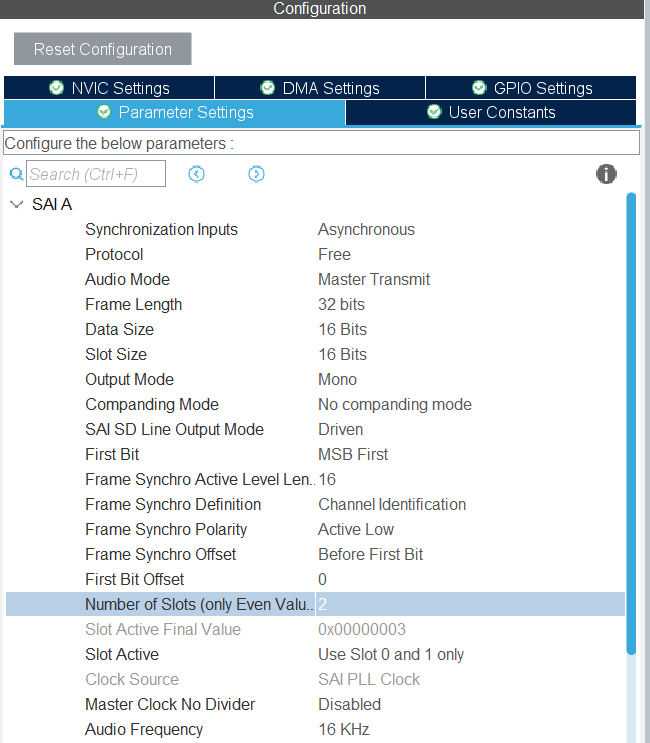 • Configuring SAI1_Block_A as master transmitter, 16‑bit, mono, 16 kHz.