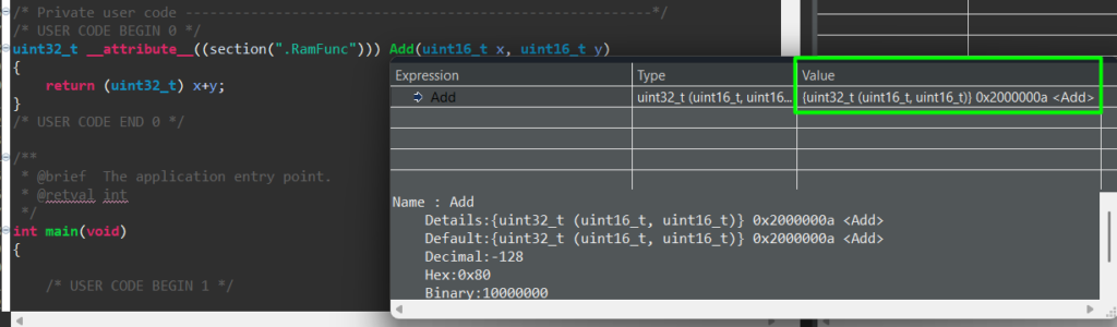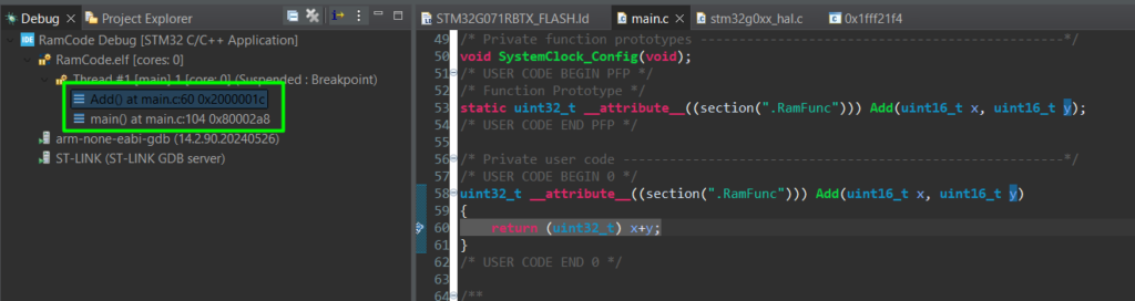 During a debug session, check the Program Counter (PC) or the Call Stack. When you step into Add function, the PC should jump from the 0x08… (Flash) range to the 0x20… (RAM) range.