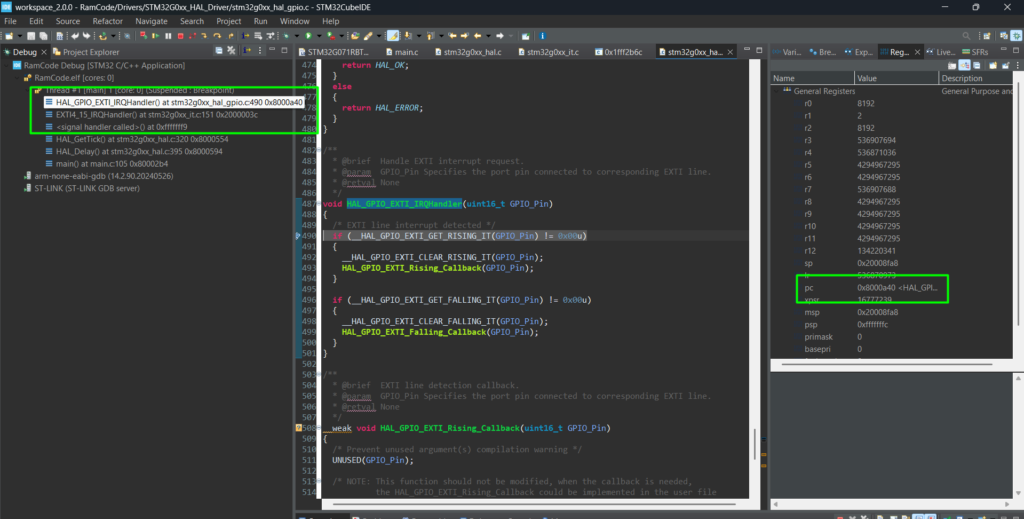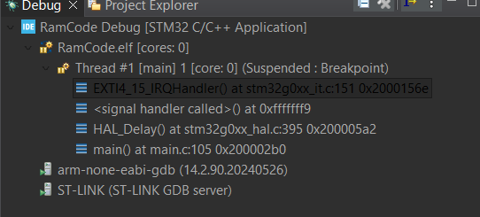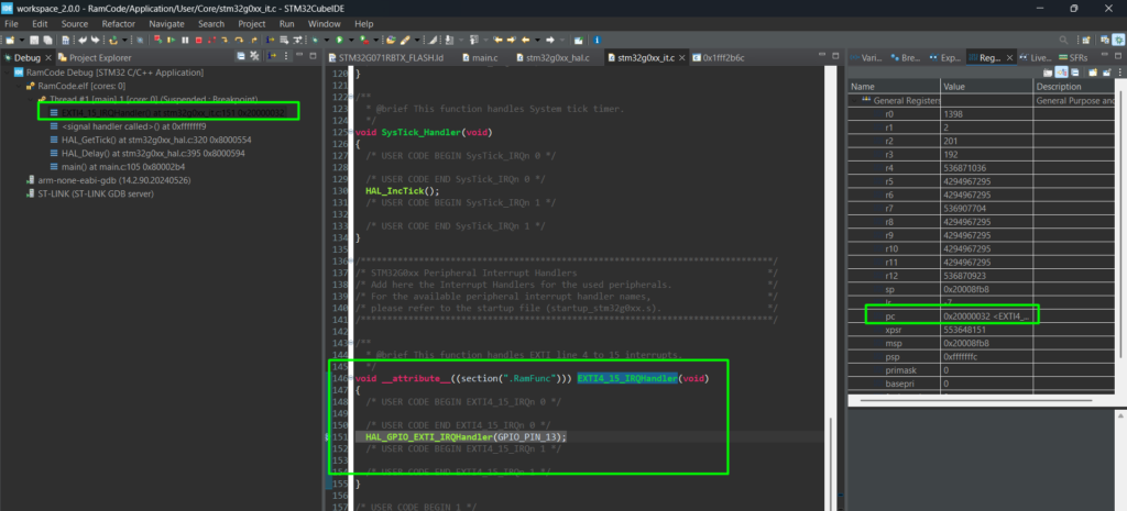 Note: Because the HAL_GPIO_EXTI_IRQHandler is still in Flash, the CPU will jump back to Flash to execute the HAL logic. For maximum performance, you should implement the entire logic within the SRAM-based ISR or move the HAL functions to RAM as well, which are more complex.