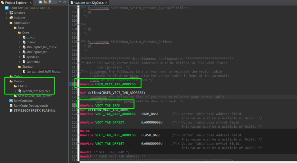 Relocating ISRs are not that common, but might be useful under specific needs, typically high-speed applications. In these cases, we can move the IRQ Handler to run from RAM