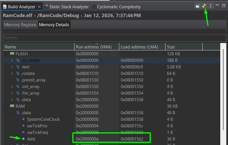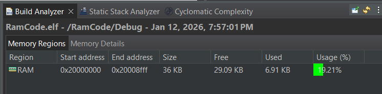 The function body remains standard C. When you build the project, the Build Analyzer will show this function’s address located within the SRAM range (typically in the initial 0x20000000s). Don’t forget to click in the refresh button first!