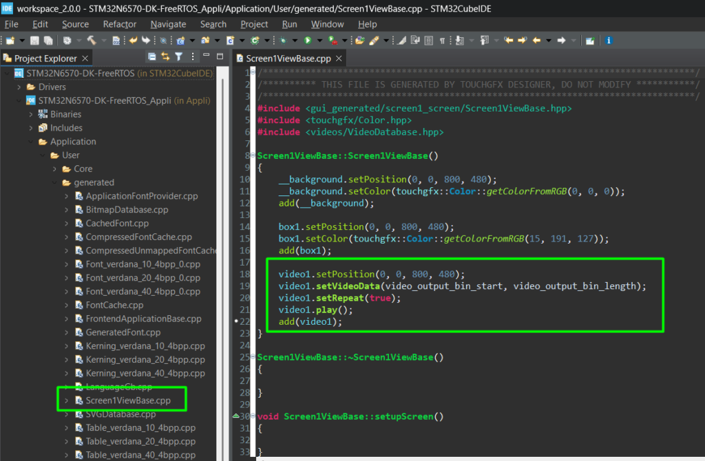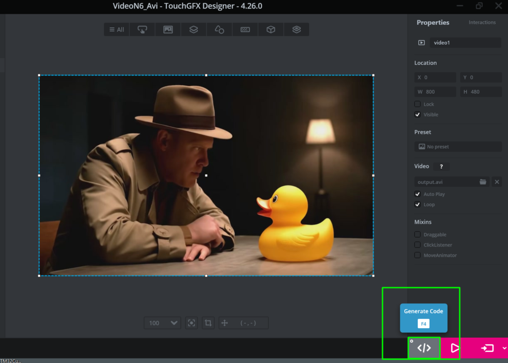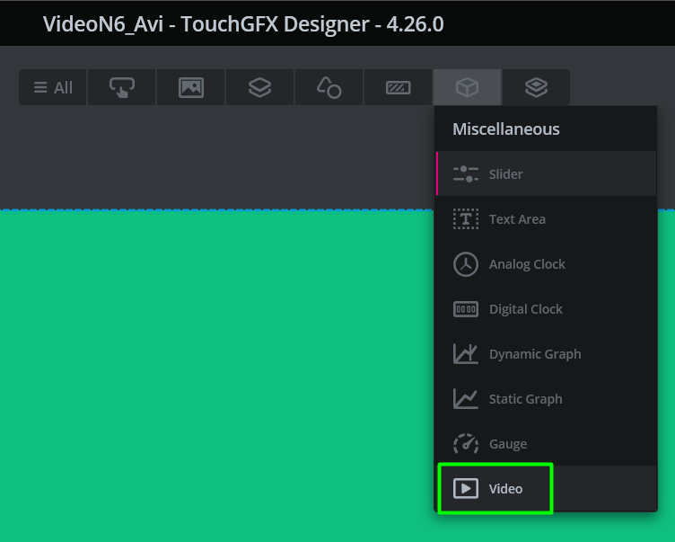 Video is included in the user interface through the Video Widget. This widget is available in TouchGFX Designer and can be added to the user interface as any other widget.
