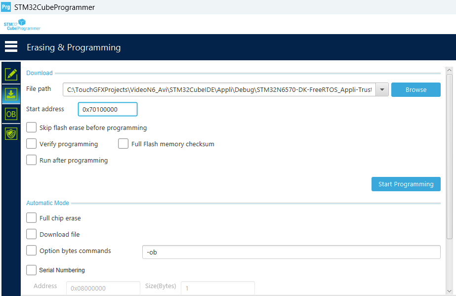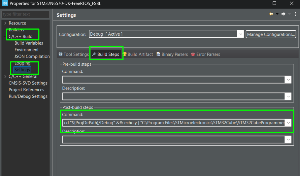 OK, so these headers are added by invoking a signing tool, part of the STM32CubeProg, but don’t worry, with a simple post-build command, added for each project (FSBL and Appli) we can get it done. The Appli will also have a post-build command that places all assets (videos, images and other resources) into a given region of the external memory via a hex file. The signed binaries are in bin format.