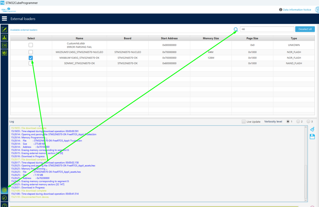 Within the STM32CubeProg, add the external memory loader for the onboard NOR FLASH memory: