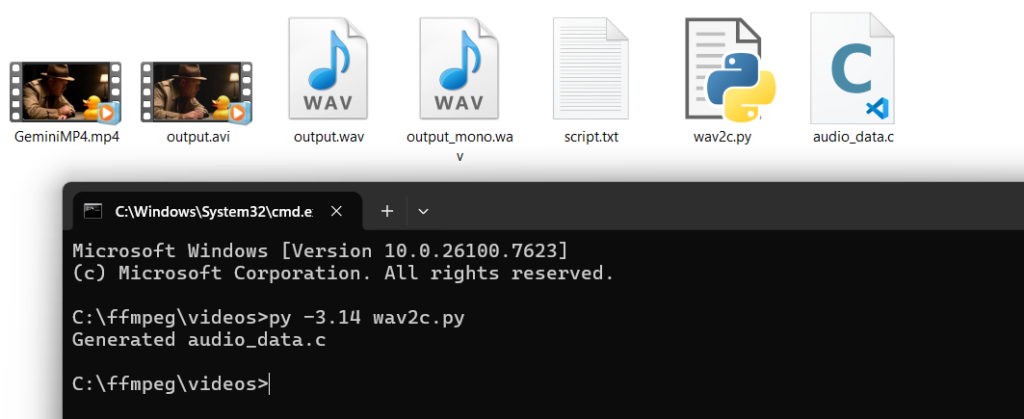 Overall, using the ffmpeg and a simple python script, we can break down the simple initial mp4 video into the avi with no audio, the wav audio, wav audio converted into mono at a selected frequency and finally the audio_data.c for transfer.