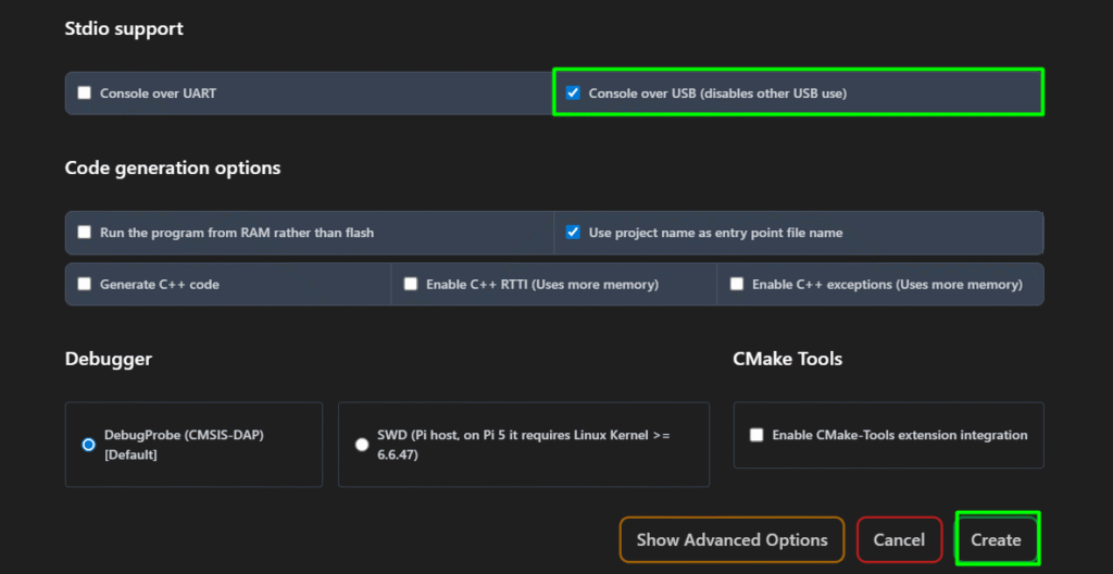 - Choose the Stdio support “Console over USB” and Crete the Project: