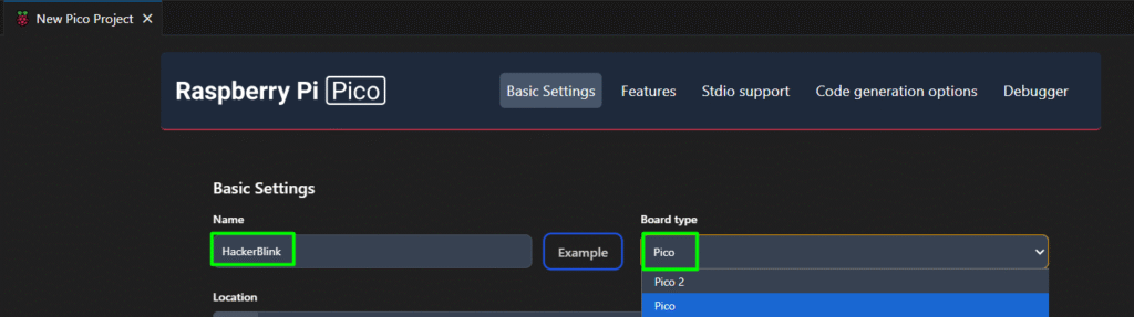 - Select an empty folder for your project (e.g., ~/pico-projects/HackerBlink).