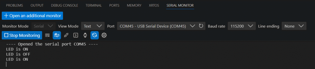 - printf(…): Prints a message to the serial console every time the LED state changes, confirming that the code is running and functioning as expected.