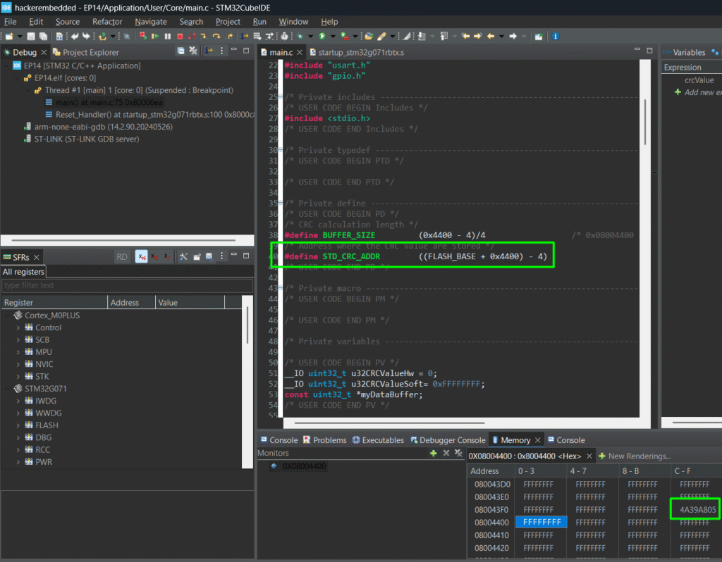 - The calculated CRC value is then inserted into the file at the memory address specified: $0x080040FC$.