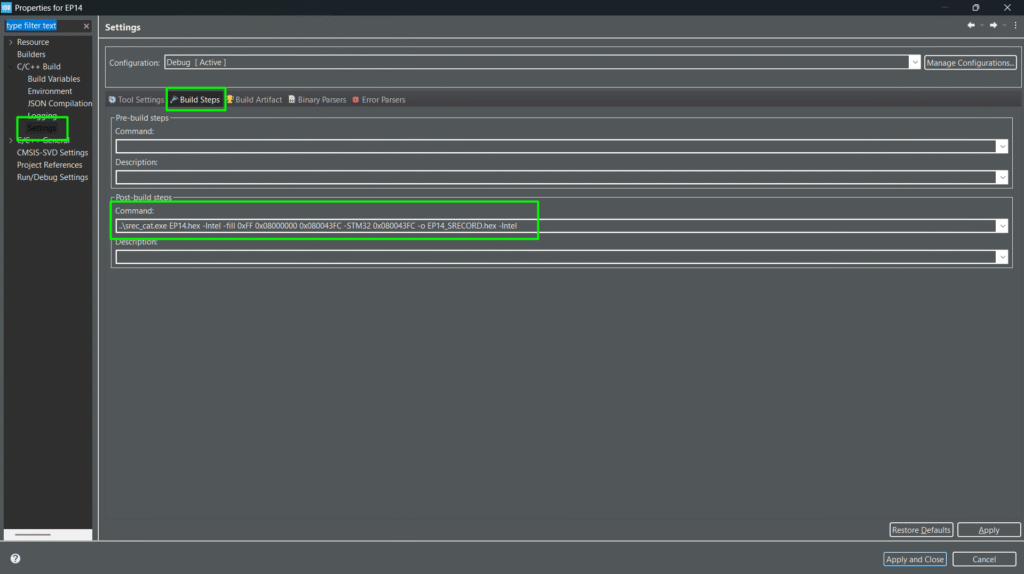 - ..\srec_cat.exe YOUR_PROJECT_NAME.hex -Intel -fill 0xFF 0x08000000 0x080040FC -STM32 0x080040FC -o YOUR_PROJECT_NAME_SRECORD.hex -Intel