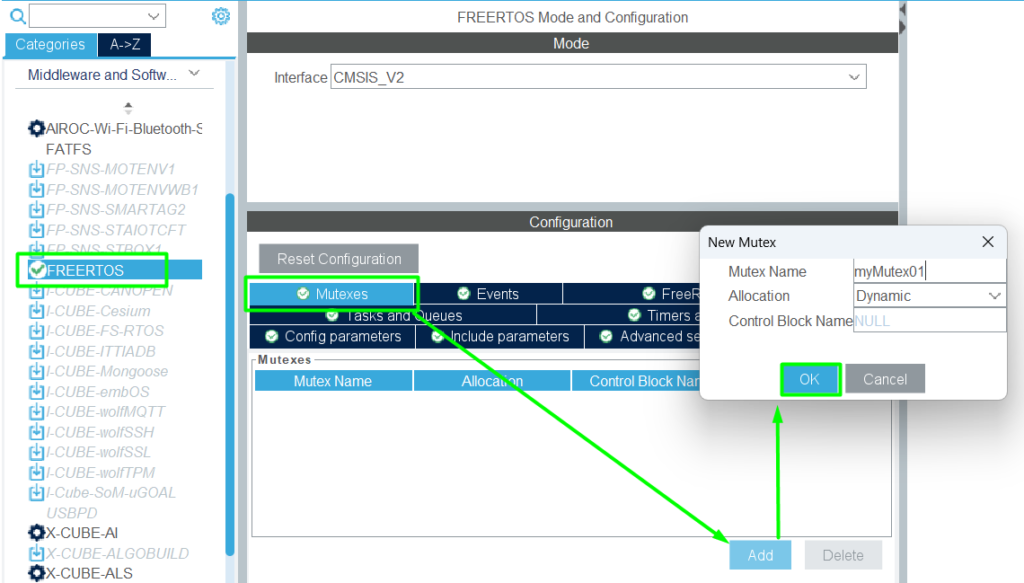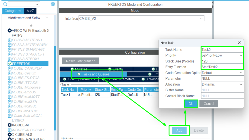 Add the FreeRTOS Middleware and select the API, in this case, CMSIS-V2: