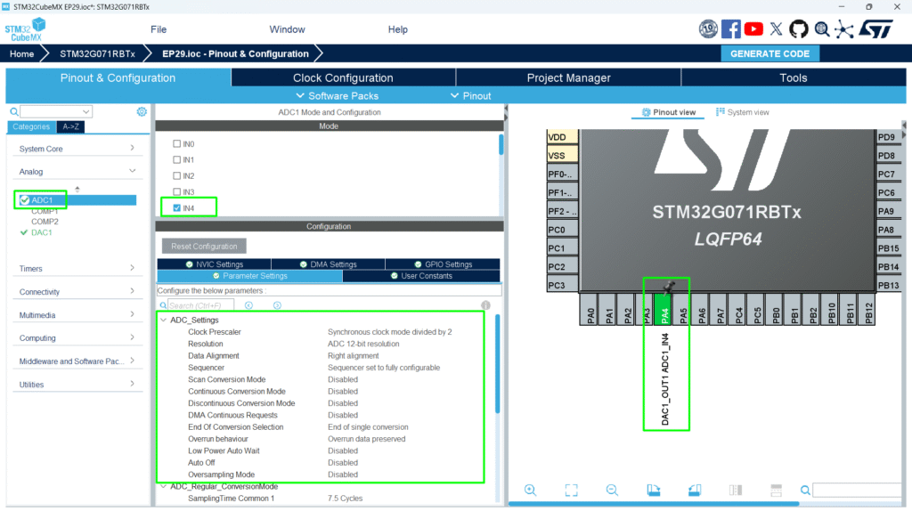 2. Initialize ADC to read input signal (make sure to click on the GPIO and + ADC)