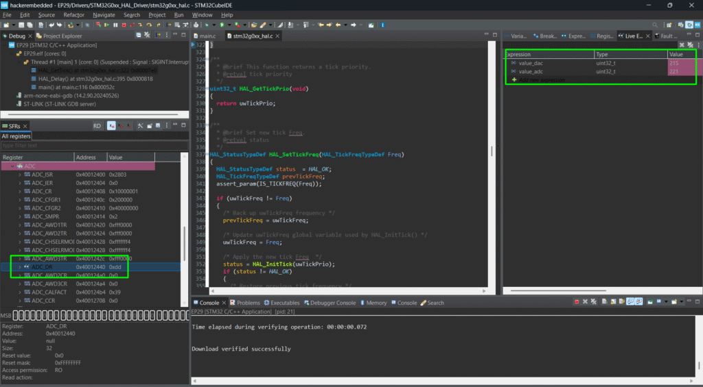 4. Observe ADC and DAC registers, variables and the wave form using the scope