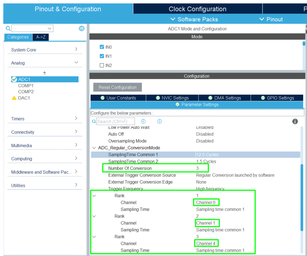 - As fully configurable, the user can select the order of channels to be read and individual sample time per channel using the Rank system. The main limitation is that this mode allows only up to 8 ranks. Example: Channels 0, 1, 2 → measured in order rank order, fully customizable