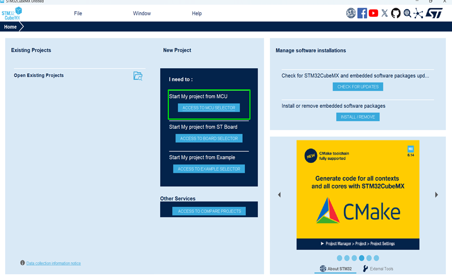 - Launch STM32CubeMX.