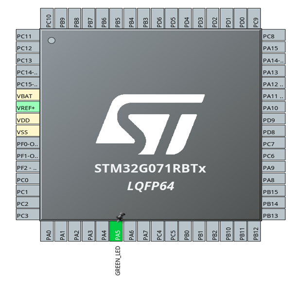 - Example: On Nucleo boards, the user LED is usually PA5 and that is the case for the selected board: NUCLEO-G071RB