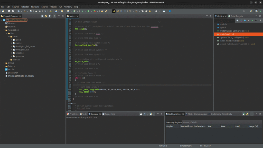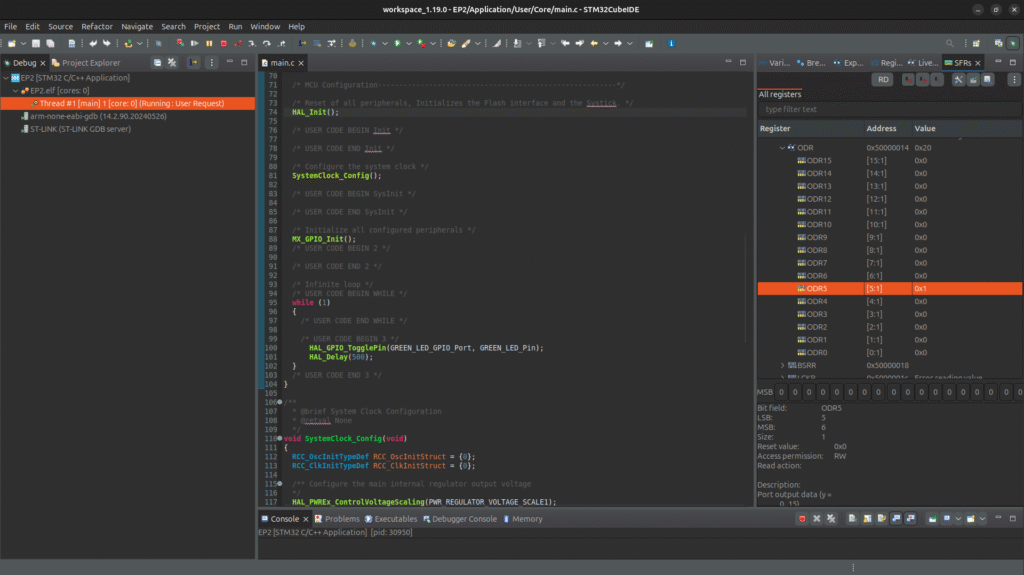 - STM32CubeIDE will compile, flash, and run your code.