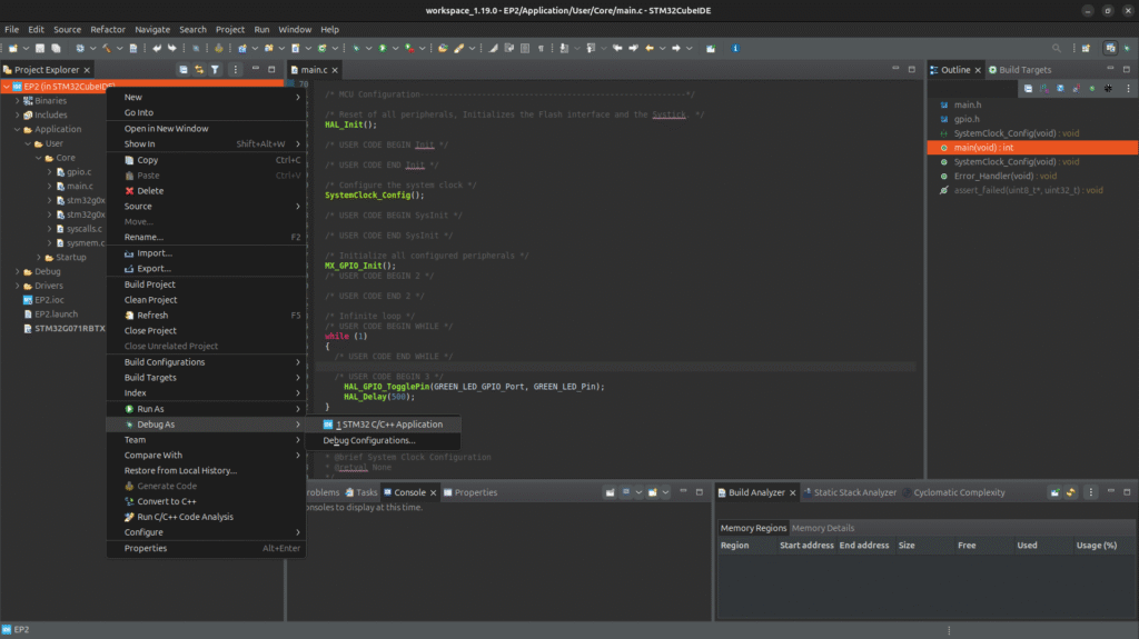 - Right Click the Project name and locate the [Debug As] and select [STM32 C/C++ Application]. Default configuration will work.