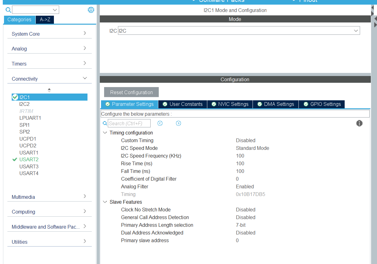 • For interrupt-based I2C, enable I2C1 Event and Error Interrupts.