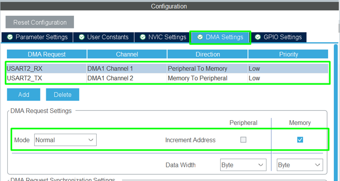 - For DMA-based reception, enable USART DMA Tx and Rx.