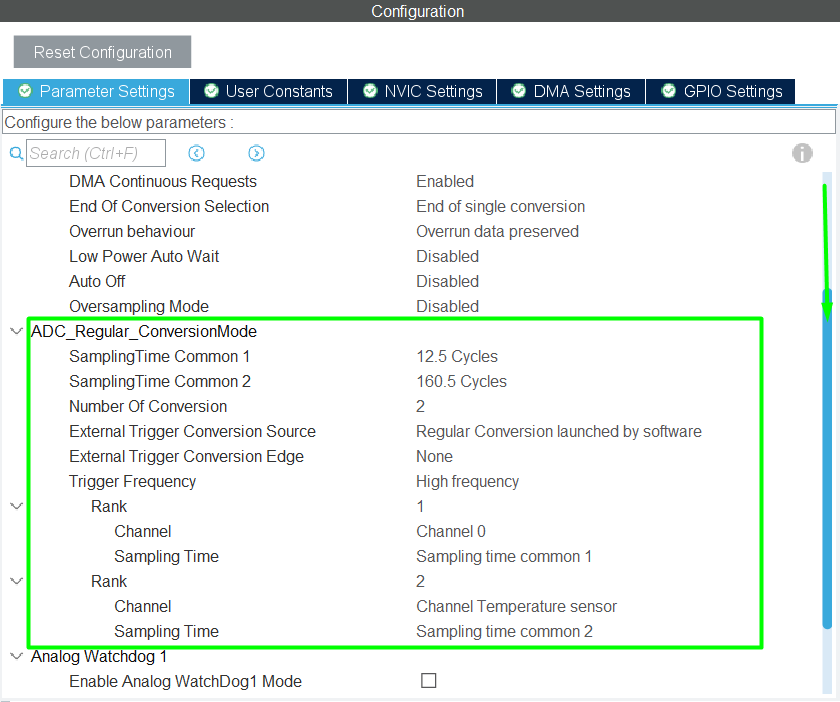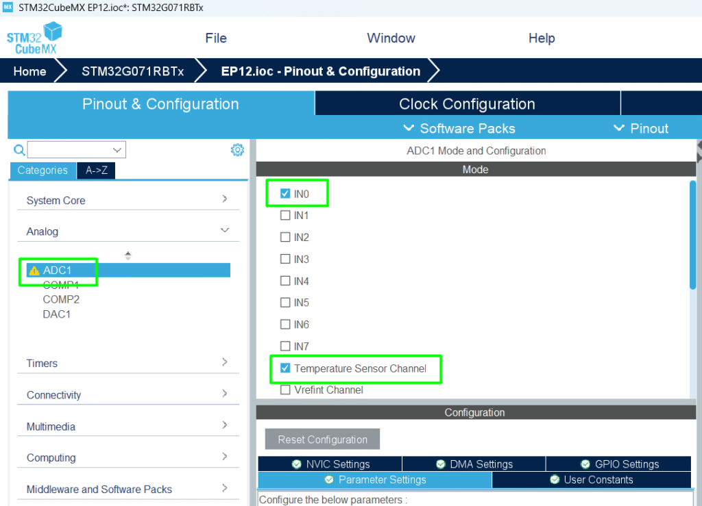 - Enable ADC1 on your sensor pin (e.g., PA0) and the Temperature Sensor