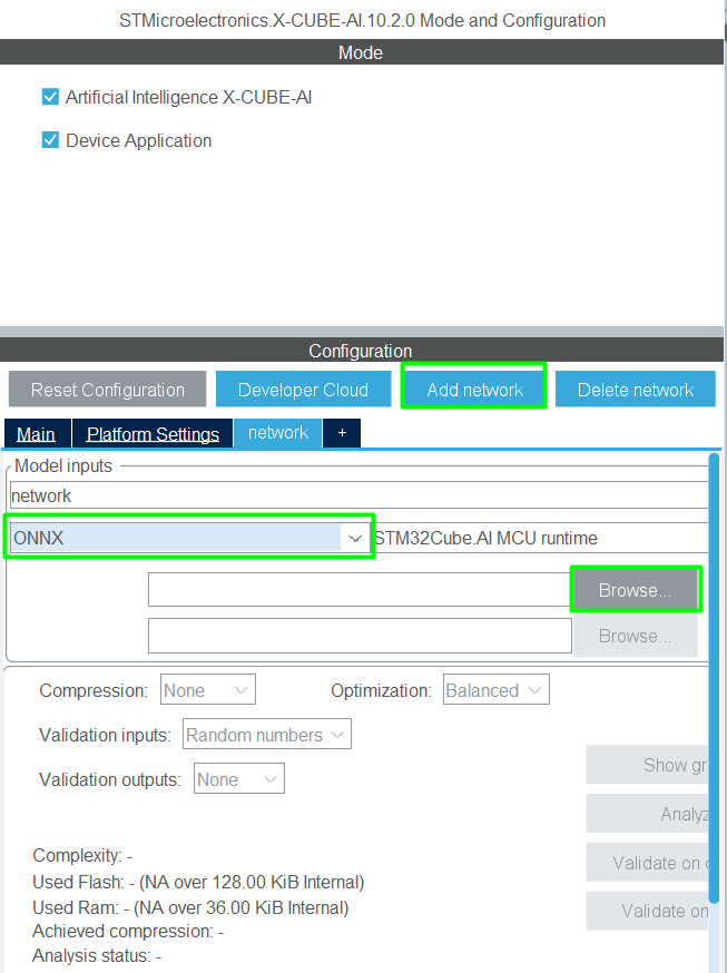 Once loaded, Configure and Analyze: X-CUBE-AI will analyze the model, provide memory and performance estimates, and allow you to select the desired optimization and quantization options: